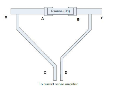 الشكل 2 مثال للتصميم الخاطئ. إذا كنت تريد قراءة 100mV من خطوط الإحساس ، فستكون هناك خسارة في الجهد تقل عن 100mV مع فقدان الجهد من الفرق بين A-X و B-Y على Rsense. سيؤدي ذلك إلى قراءة أقل من القيمة الفعلية للتيار المراد قياسه.